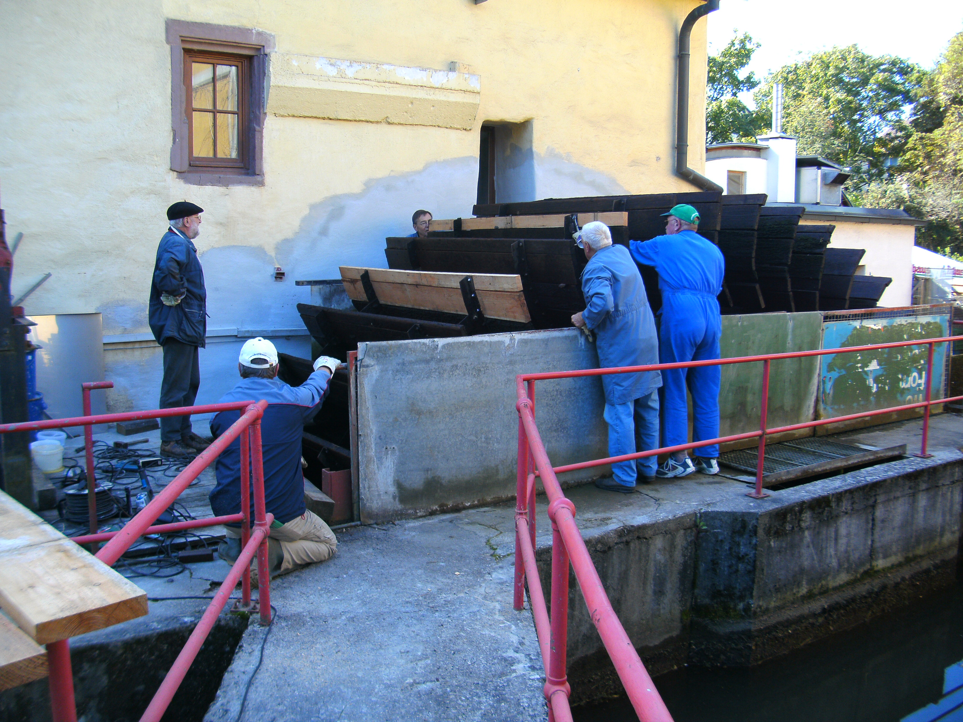 Achtundvierzig Schaufeln hat es, unser vor 35 Jahren an der Obermühle installiertes Wasserrad. Wenn es sich dreht, dann mit 3 ½ Umdrehungen pro Minute und mit einer beschaulichen Geräuschkulisse. Trotz seiner beachtlichen Größe von 7,50 m Durchmesser und 2,50 m Breite kommt es immer öfter zum Stillstand.