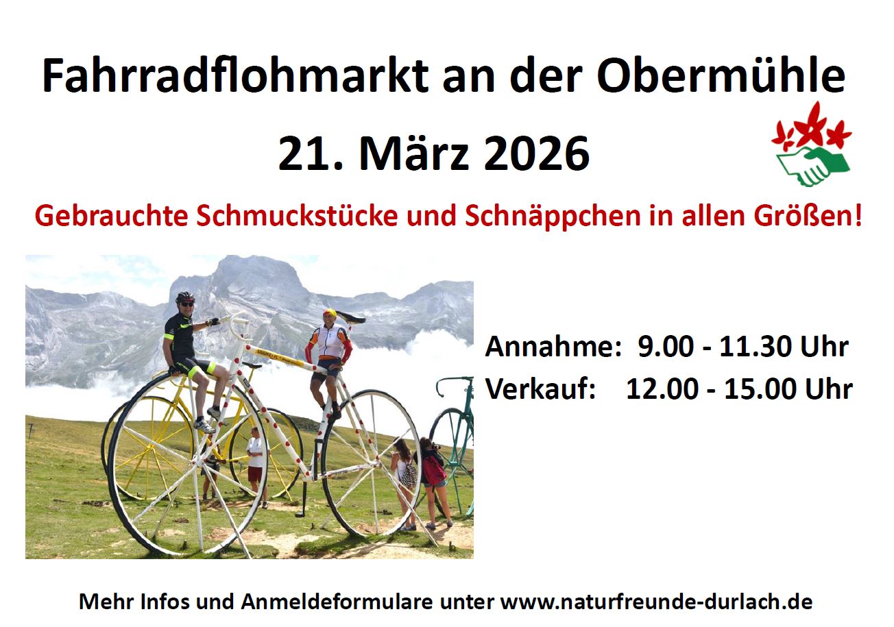 Am 21. März findet der diesjährige 15. Fahrradflohmarkt an der Obermühle, Alte Weingartener Straße 37, statt. Abgabe der Räder ist von 9:00 bis 11:30 Uhr, Verkauf durch die NaturFreunde von 12:00 bis 15:00 Uhr. Angeboten werden gut erhaltene, gebrauchte Fahrräder - vom Alltagsrad, Trekkingrad und Rennrad bis hin zum Kinderrad aber auch Fahrradanhänger.